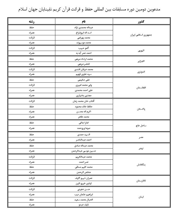 اسامی شرکتکنندگان این دوره از مسابقات به تفکیک کشور و رشته در جدول ذیل منتشر شده است.