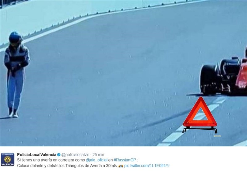 پلیس والنسیا در صفحه توییتر این سازمان، برای توضیح اقدامات لازم به رانندگانی که خودروهایشان در جاده یا خیابانها دچار نقص فنی میشود و از کار میافتد، از عکسی از صحنه منصرف شدن آلونسو از شرکت در مسابقه اصلی گرندپری روسیه استفاده کرده و روی زخمهای رانند اسپانیایی مک لارن نمک ریخته است.