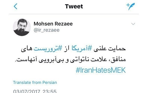 دبیر مجمع تشخیص مصلحت در صفحه توئیترش نوشت: حمایت علنی آمریکا از تروریست‌های منافق، علامت ناتوانی و بی‌آبرویی آنهاست.