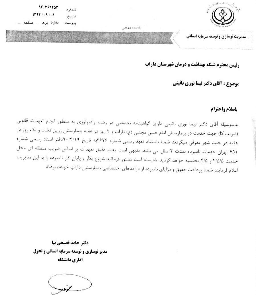 وی میافزاید: با توجه به اینکه مشکل کمبود نیروی سونوگرافیست یک مشکل کشوری است و تنها مختص شهرستان داراب نیست تا اطلاع ثانوی توانایی جذب نیروی سونوگرافیست برای درمانگاه جنتشهر وجود ندارد ، اولویت جذب سونوگراف با مرکز شهرستان است و دیگر مراکز درمانی شهرستان داراب در اولویتهای بعدی قرار دارند.