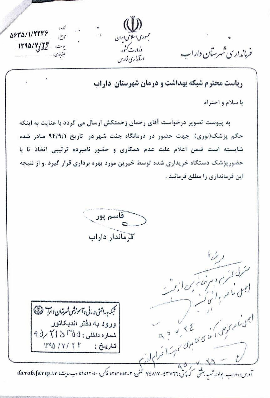 وی میافزاید: بعد از گذشت 3 سال و با وجود دستور دانشگاه علوم پزشکی شیراز مبنی بر تامین متخصص سونوگرافی برای درماگاه جنتشهر و درخواست فرمانداری داراب برای استقرار سونوگرافیست در جنتشهر، شبکه بهداشت داراب هیچ اقدامی در این زمینه نکرده و به دلیل بهانههای مختلف از جمله کمبود پزشک متخصص این دستگاه سونوگرافی در درمانگاه جنت شهر بدون استفاده مانده است.