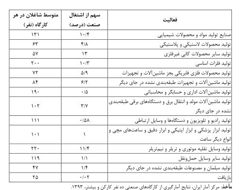 براساس آمارهای مرکز آمار ایران، متوسط تعداد کارکنان در هر بنگاه صنعتی افزایش یافته است که این افزایش به بیش از 31 درصد میرسد. این درحالی است که در همین مدت کمتر از 19 درصد به تعداد شاغلان کارگاههای صنعتی افزوده شده است .در نگاه اولیه، این نوعی تناقض محسوب می شود ،اما با توجه به کاهش تعداد بنگاهها و تعطیلی واحدهای صنعتی طی سالهای اخیر، امری قابل پذیرش خواهد بود.