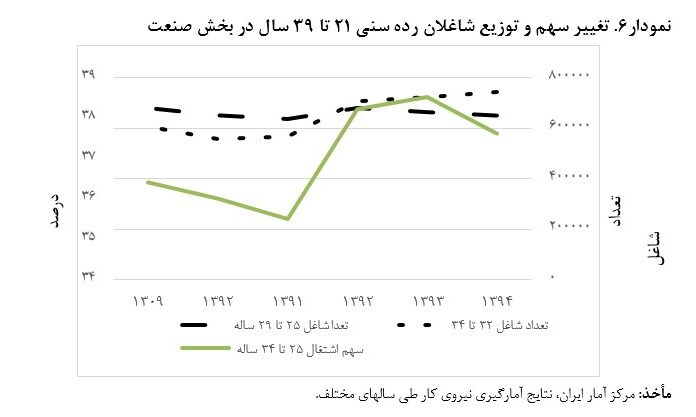 تغییر در ترکیب نیروی انسانی شاغل برحسب رده سنی در سال های اخیر نیز از دیگرمهمترین تحولات در بخش صنعت است. اگرچه افراد فارغ التحصیل دانشگاهی از مقطع کاردانی تا فوقلیسانس عمدتاً در رده سنی 23 تا 30 سال قرار میگیرند. اما از سال 1392 به بعد (مطابق نمودار 6)، تعداد شاغلین رده سنی 25 تا 29 سال با روند ملایم نزولی مواجه بوده و این به معنای کاهش تعداد ورودی نیروی کار تحصیلکرده تازه فارغ التحصیل شده به بخش صنعت است در صورتیکه در همین دوره، شاغلین رده سنی 30 تا 39 سال افزایش داشته و این به معنای بالا رفتن سن شاغلین بخش صنعت بهخصوص در سالهای اخیر است. عدم تناسب در روند تعداد ورودی به بخش صنعت و افزایش سن شاغلین این بخش میتواند یکی از چالشهای آینده این بخش باشد .