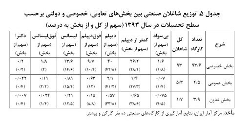 بررسی ترکیب شاغلان برحسب بخش خصوصی و دولتی نشان میدهد که بخش خصوصی حدود 94 درصد از کل کارگاههای صنعتی و 93 درصد از کل شاغلان در بخش صنعت را بهخود اختصاص داده است. این موضوع اهمیت بخش خصوصی در ایجاد اشتغال در بخش صنعت را نشان میدهد. شواهد نشان میدهد که بخش خصوصی بیشتر مایل به استخدام نیروی کار با تحصیلات دیپلم و کمتر از دیپلم داشته است، به طوری که حدود 71 درصد از کل شاغلان کارگاههای صنعتی ده نفرکارکن و بیشتر در سال 1393 دارای تحصیلات دیپلم و کمتر از دیپلم بودهاند. در بخش عمومی نیز این سهم 68 درصد بوده است. اگر شاغلان دارای تحصیلات فوق دیپلم نیز به این رقم اضافه شود، مشاهده می شود که بخش های خصوصی و دولتی به ترتیب 81 درصد و 80 درصد از شاغلان خود را از بین کسانی انتخاب کردهاند که تحصیلات آنها فوق دیپلم و کمتر بوده است. این الگو نشان می دهد که تفاوت معناداری بین ترکیب نیروی کار بخش خصوصی و دولتی از ابعاد تحصیلات وجود ندارد و بخش صنعت تلاش کرده است که بخش اصلی نیروی کار خودرا از بین کسانی انتخاب کند که تحصیلات عمده دانشگاهی بالایی ندارند .