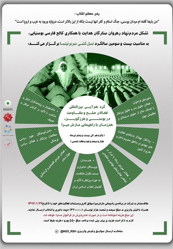 به گزارش خبرنگار فرهنگی باشگاه خبرنگاران پویا، تشکل مردمنهاد رهروان ستارگان هدایت با همکارى کالج فارسی بوسنیایى برای حضور پژوهشگران، نویسندگان، خبرنگاران و فعالان صلح و مقاومت در راهپیمایی بزرگ مارشمیرا فراخوان داد. این راهپیمایی به مناسبت بیستوسومین سالگرد نسلکشی و قتل عام 8هزار مسلمان بوسنیایی برگزار میشود.