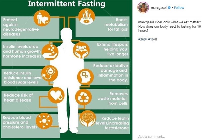 به گزارش گروه رسانه های خبرگزاری تسنیم، مارک گسال ستاره اسپانیایی تیم ممفیس گریزلیز لیگ برتر حرفهای آمریکا (NBA) در صفحه اینستاگرامش اینفوگرافیکی را در خصوص فواید امتناع از غذاخوردن منتشر کرد.