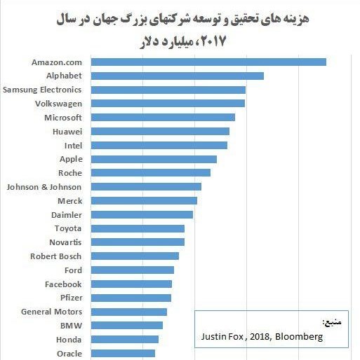 استین فاکس، روزنامه نگار نشریه بلومبرگ آمریکا، آمارهای بسیار جالبی در خصوص میزان هزینههای تحقیق و توسعه شرکتهای بزرگ جهانی در سال 2017 ارائه کرده است (نمودار پایین)