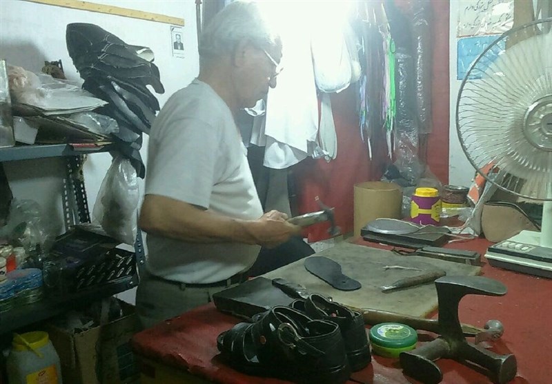 به گزارش خبرگزاری تسنیم از بیرجند، میز کارش تنهای از درخت است با دستانش ابزار و تکهای از از چرم را در دست دارد و اطرافش پر است از میخ پایه کوتاه، چکش و نخ، محل کارش کوچک است و با پنکهای رنگ و رو رفته محیط را خنک میکند.