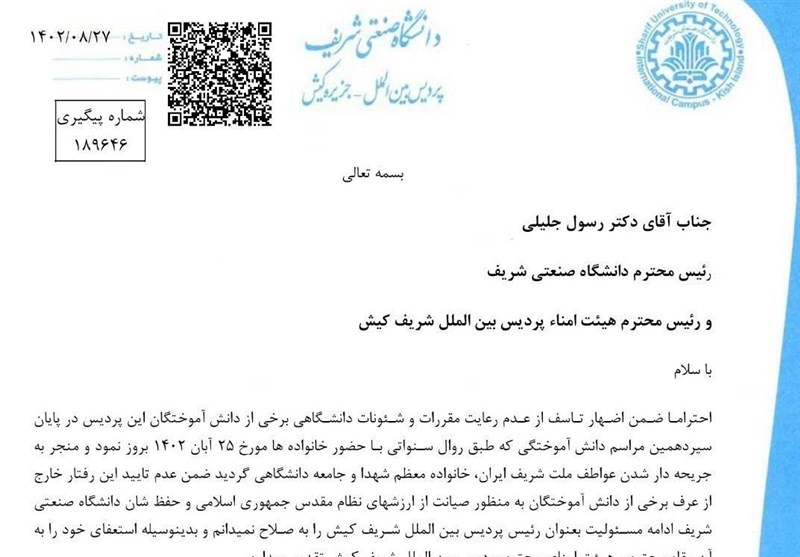 به‌دنبال حاشیه‌های ایجادشده در مراسم دانش‌آموختگی تعدادی از دانشجویان پردیس بین‌الملل کیش دانشگاه صنعتی شریف ریاست این دانشگاه استعفا داد.