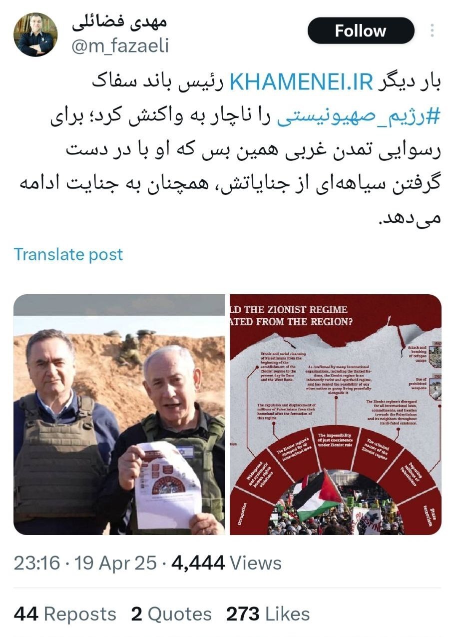 مهدی فضائلی، عضو دفتر حفظ و نشر آثار رهبر انقلاب در توئیتر نوشت: بار دیگر KHAMENEI.IR رئیس باند سفاک رژیم صهیونیستی را ناچار به واکنش کرد؛ برای رسوایی تمدن غربی همین بس که او با در دست گرفتن سیاهه‌ای از جنایاتش، همچنان به جنایت ادامه می‌دهد.