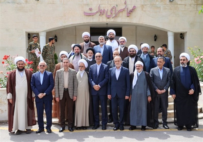 به گزارش خبرگزاری تسنیم از کرمانشاه، مسعود پزشکیان‌ ظهر امروز ‌در ادامه برنامه‌های سفر استانی دولت وفاق ملی به کرمانشاه، در ضیافت ناهار با جمعی از علما و بزرگان مذاهب اسلامی، از جمله علمای شیعه و اهل سنت، ائمه جمعه و جماعات، اساتید و فضلای حوزه‌های علمیه و نمایندگان جامعه اهل حق استان کرمانشاه، حضور یافت و طی سخنانی با اشاره به مبانی قرآنی و سیره نبوی، بر ضرورت تحقق همگرایی ملی و انسجام امت اسلامی تأکید کرد.
