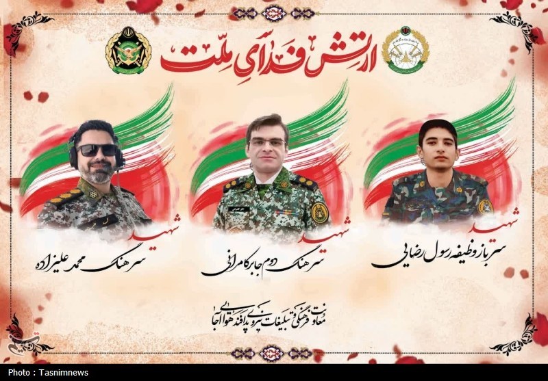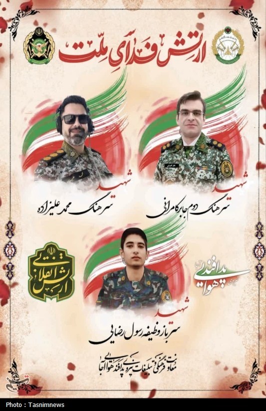 شهید سرهنگ دوم جابر کامرانی، شهید سرهنگ محمد علیزاده و شهید سرباز وظیفه رسول رضایی از شهدای اخیر حمله جنایتکارانه رژیم صهیونی به خاک میهن اسلامی است که فردا بر روی دوش مردم انقلابی شهر مقدس قم تشییع میشوند.