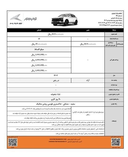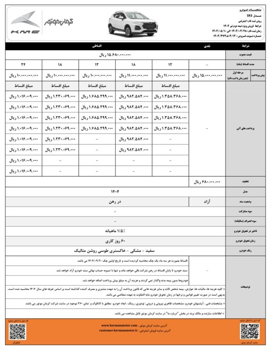 این خودرو که به عنوان جایگزین جک S3 شناخته میشود، با طراحی مدرنتر، امکانات بهروز و قیمت مصوب یک میلیارد و 568 میلیون تومان عرضه میشود. شرایط فروش شامل پیش پرداخت متنوع و اقساط 12، 18 و 24 ماهه است. کرمان موتور برای کسانی که خودروی KMC SR3 را به صورت نقدی خریداری کنند، 68 میلیون تومان تخفیف خرید نقدی در نظر گرفته است.