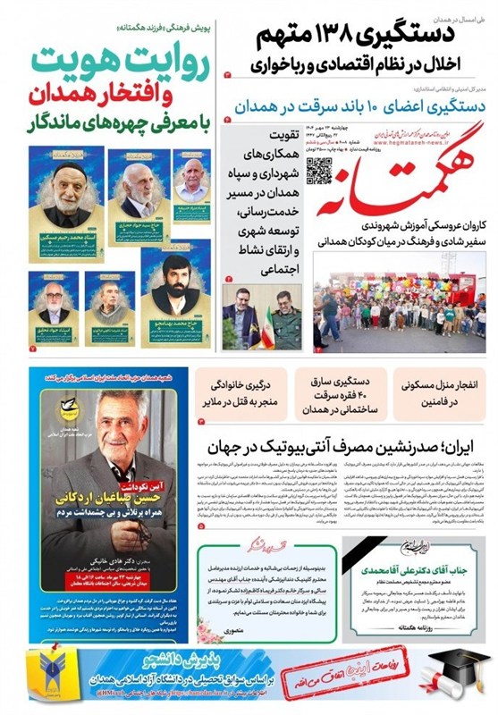 به گزارش خبرگزاری تسنیم از همدان، تصاویر منتخب صفحات نخست روزنامههای پنجشنبه بیستوچهارم مهرماه در استان همدان منتشر شد. این صفحات نخست، نمایانگر مهمترین اخبار، تحولات و رویدادهای اجتماعی، سیاسی، اقتصادی و فرهنگی استان و کشور هستند و نگاه رسانهها را به مسائل روز همدان منعکس میکنند.