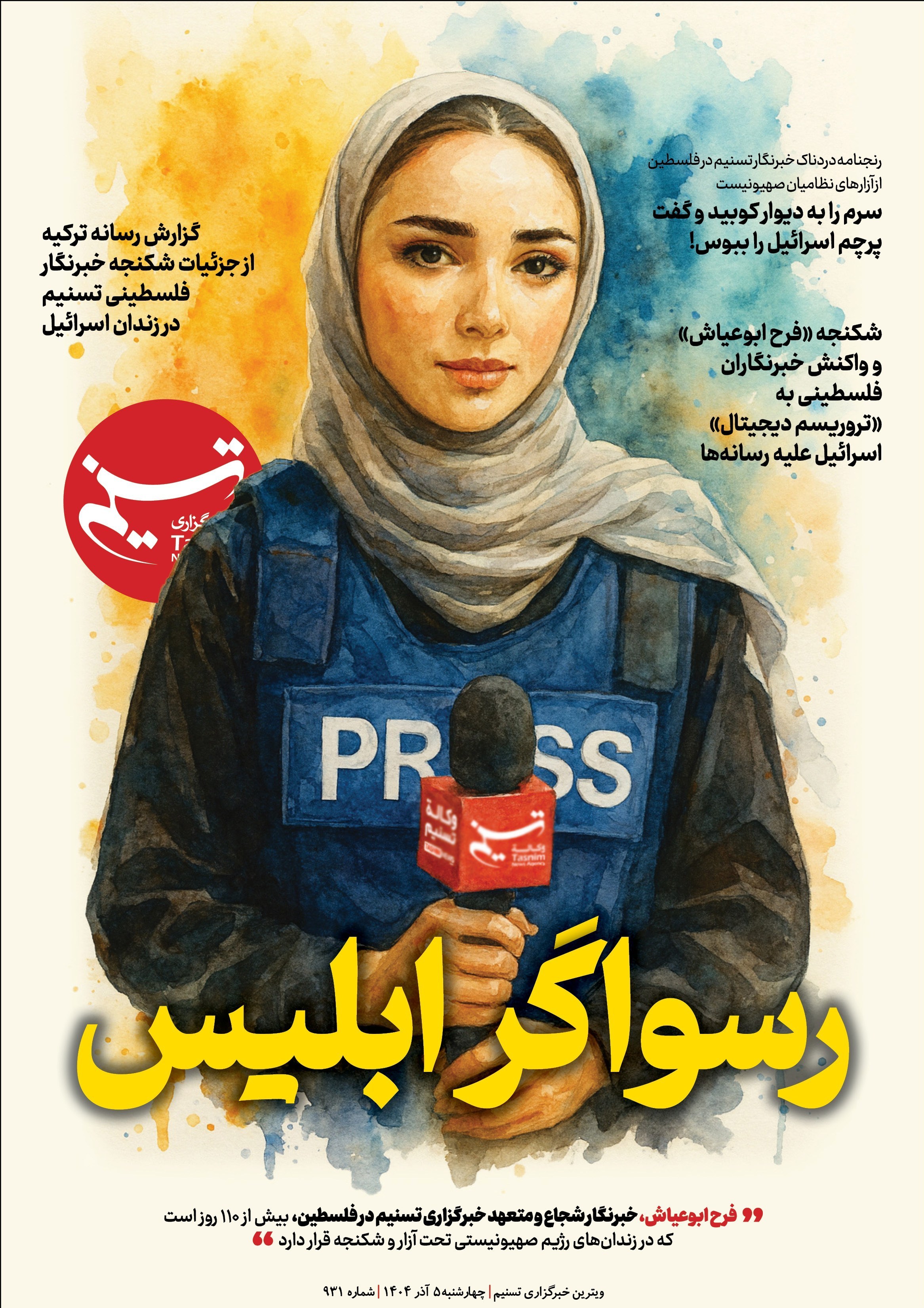 فرح ابوعیاش، خبرنگار فلسطینی خبرگزاری تسنیم، 110 روز است که پس از یورش شبانه صهیونیست‌ها بازداشت شده و در زندان «مسکوبیه» تحت شکنجه قرار دارد و رنجنامه او تصویری تکان‌دهنده از نقض حقوق بشر ارائه می‌کند.