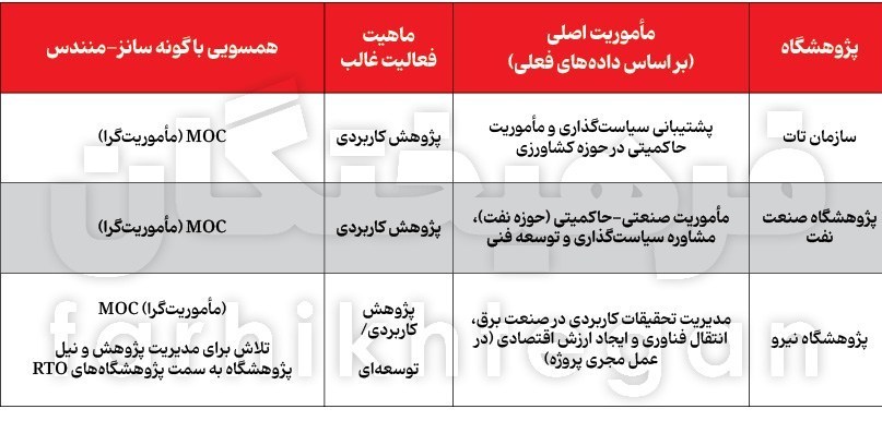 بررسی سه پژوهشگاه دولتی منتخب ــ پژوهشگاه صنعت نفت، پژوهشگاه نیرو و سازمان تحقیقات، آموزش و ترویج کشاورزی (تات) ــ نشان می‌دهد که این نهاد‌ها اگرچه در قالب مراکز مأموریت‌گرا (MOC) شکل‌گرفته‌اند؛ اما در عمل درگیر نوعی ابهام نقش میان «اجرای پژوهش» و «مدیریت پژوهش» هستند. مأموریت اولیه آن‌ها بر رفع نیاز‌های دستگاه مادر متمرکز بوده، ولی به دلیل نبود تقسیم کار نهادی روشن، ضعف در نظام ارزیابی عملکرد و آیین‌نامه‌های ارتقای مبتنی بر مقاله‌محوری، بخش قابل‌توجهی از ظرفیت آن‌ها از حل مسائل واقعی کشور فاصله گرفته است.
