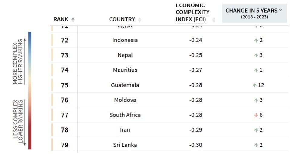 این موضوع منجر به گیر کردن اقتصاد ایران در دام تله درآمد پایین بوده است و نتوانسته با سیاست گذاری درست، منابع کشور را به سمت صنایعی با ضریب ارزش افزوده بالاتر هدایت کند. این گزاره را به خوبی در رتبه ایران در شاخص پیچیدگی اقتصادی می توان مشاهده کرد. بطوری که در سال 2023 رتبه ایران در شاخص ضریب پیچیدگی اقتصادی اعلامی از سوی دانشگاه هاروارد رتبه 78 از بین 145 کشور بوده است.
