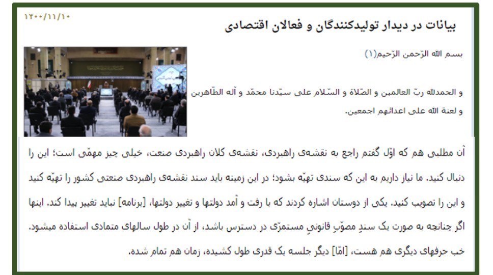 فرمایشات مقام معظم رهبری در دهم بهمنماه سال 1400 در خصوص ضرورت «تدوین سند و نقشه راهبردی صنعتی کشور»