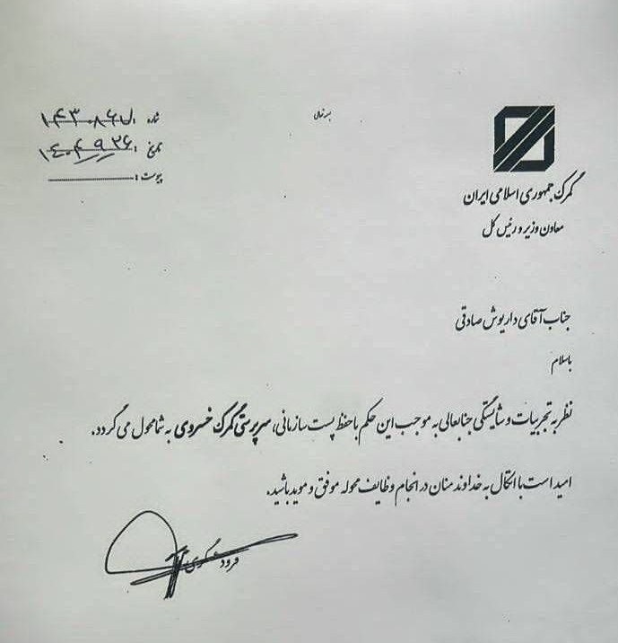 به گزارش خبرنگار اقتصادی خبرگزاری تسنیم، طی حکمی از سوی فرود عسگری، رئیسکل گمرک جمهوری اسلامی ایران، داریوش صادقی بهعنوان سرپرست گمرک خسروی منصوب شد.