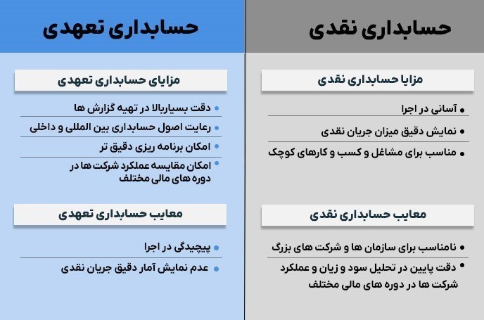 در تصویر زیر با مزایا و معایب حسابداری نقدی و تعهدی آشنا میشویم.