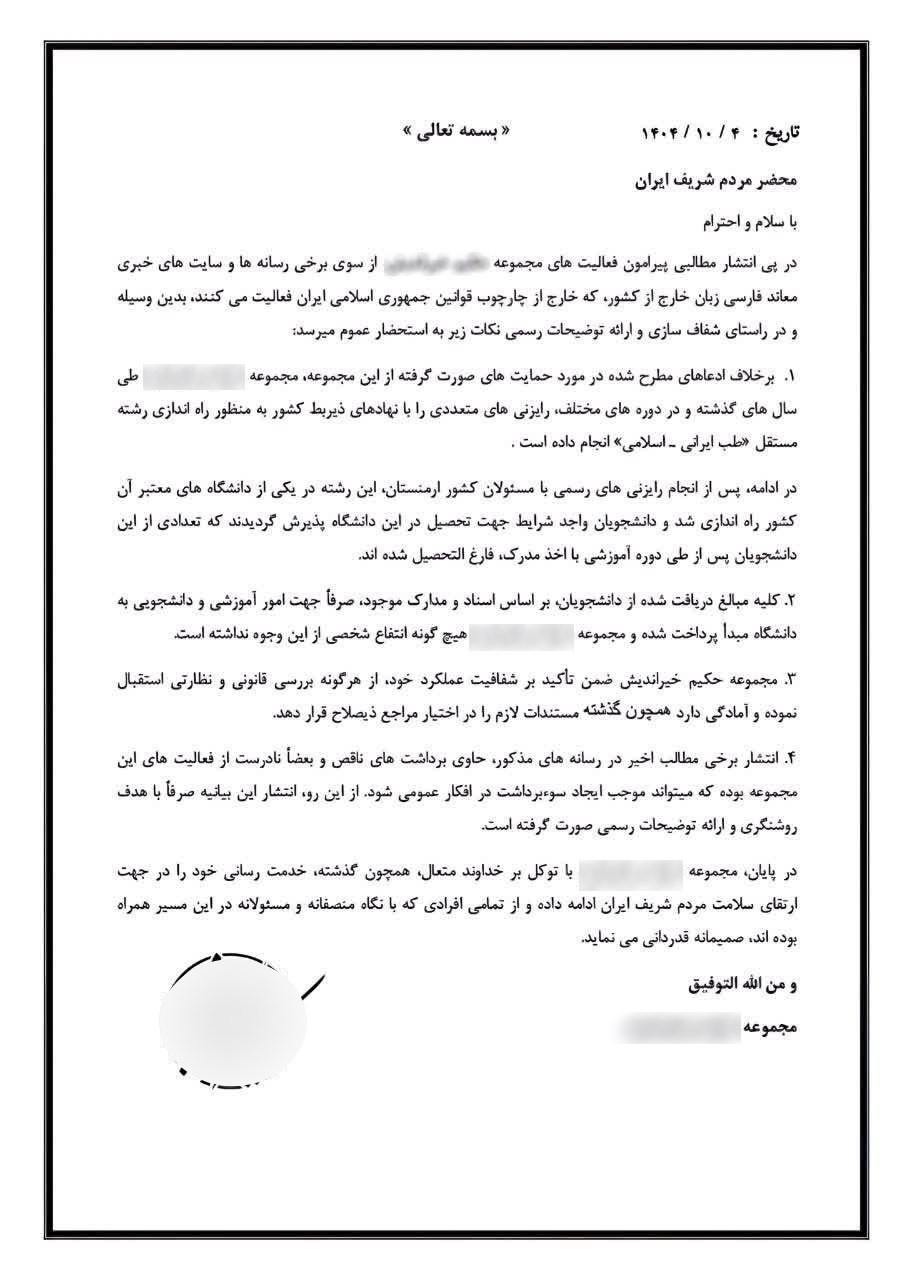 1 ـ درباره رایزنی با مسئولان رسمی جمهوری اسلامی؛ بهخلاف این ادعا که اینگونه القا میکند که فرآیند تشکیل این رشته یا دانشگاه با موافقت مسئولان کشور بوده است، تاکنون هیچ مقام رسمی بهویژه در حوزه وزارت بهداشت در تأیید این موضوع هیچ اظهارنظری نداشته است و در مقابل زبان به انتقاد از این سوءاستفاده از حوزه پزشکی و اعتبار جامعه سلامت گشودهاند،