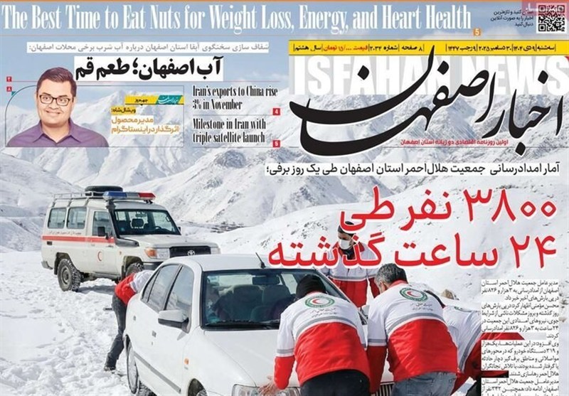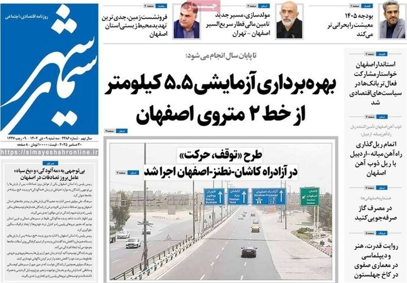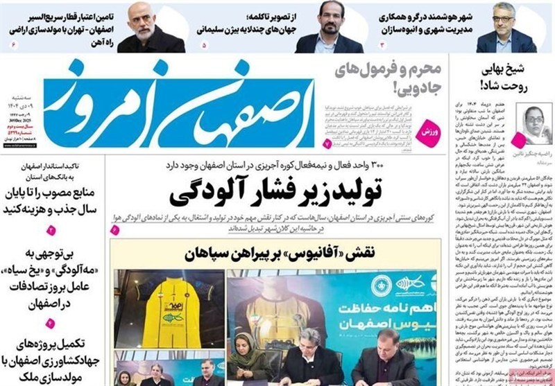 به گزارش خبرگزاری تسنیم از اصفهان، تصاویر منتخب صفحات نخست روزنامه‌های ‌سه‌شنبه 9 دی در استان اصفهان منتشر شد. این صفحات نخست، نمایانگر مهم‌ترین اخبار، تحولات و رویدادهای اجتماعی، سیاسی، اقتصادی و فرهنگی استان و کشور هستند و نگاه رسانه‌ها را به مسائل روز اصفهان منعکس می‌کنند.