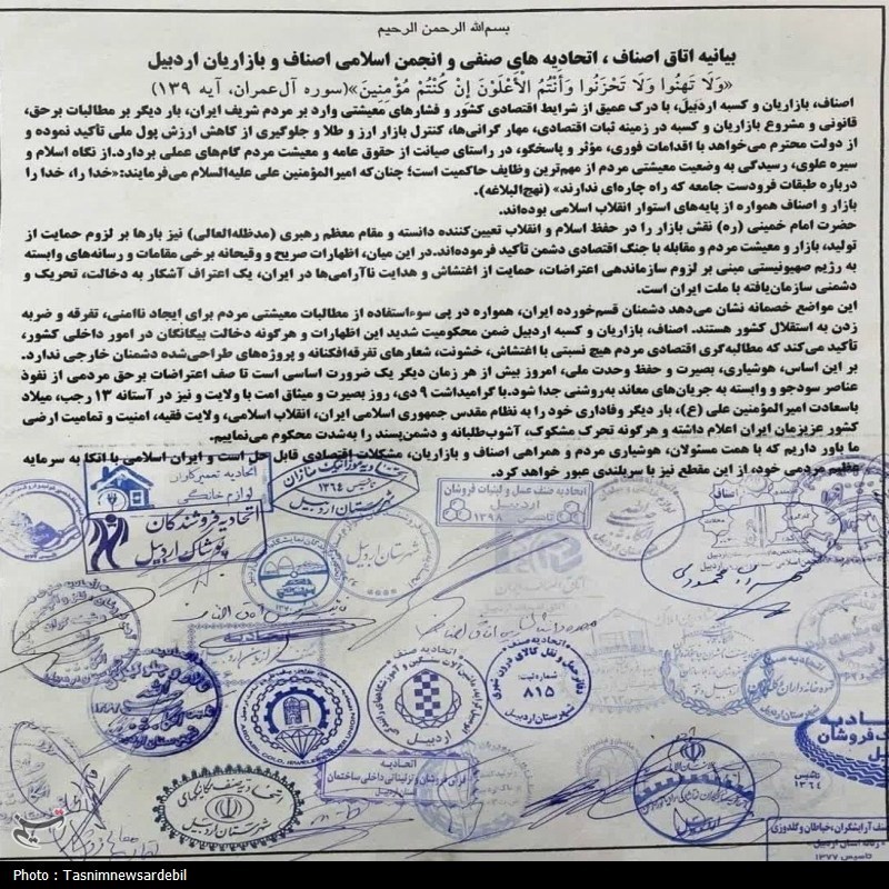 ما اصناف و بازاریان اردبیل، بار دیگر وفاداری خود را به نظام مقدس جمهوری اسلامی ایران، انقلاب اسلامی، ولایت فقیه، امنیت و تمامیت ارضی کشور عزیزمان اعلام داشته و هرگونه تحریک مشکوک، آشوبطلبانه و دشمنپسند را بهشدت محکوم مینماییم.