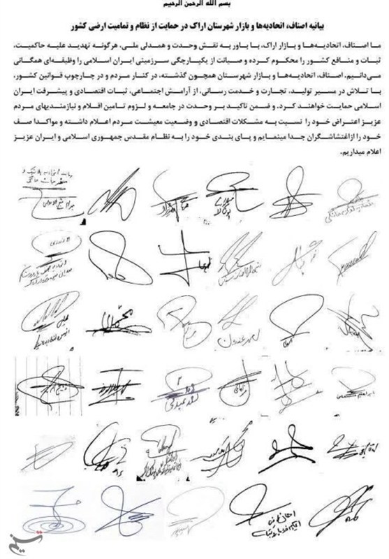 کسبه و بازاریان در اراک در این بیانیه با تاکید بر اینکه "هرگونه تهدید علیه حاکمیت، ثبات و منافع کشور را محکوم می‌نماییم" اظهار کردند: در کنار مردم و در چهارچوب قوانین کشور با تلاش در مسیر تولید تجارت و خدمت رسانی از آرامش اجتماعی ثبات اقتصادی و پیشرفت ایران اسلامی حمایت خواهیم کرد.