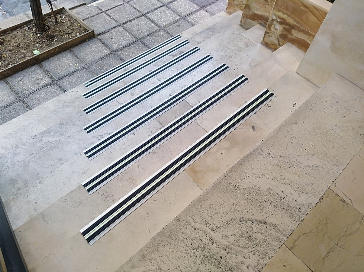 - پلههای بیرونی و پرخطر: از ترمز پله عریض با آج عمیق و جنس ضدآب و ضد UV استفاده نمایید.