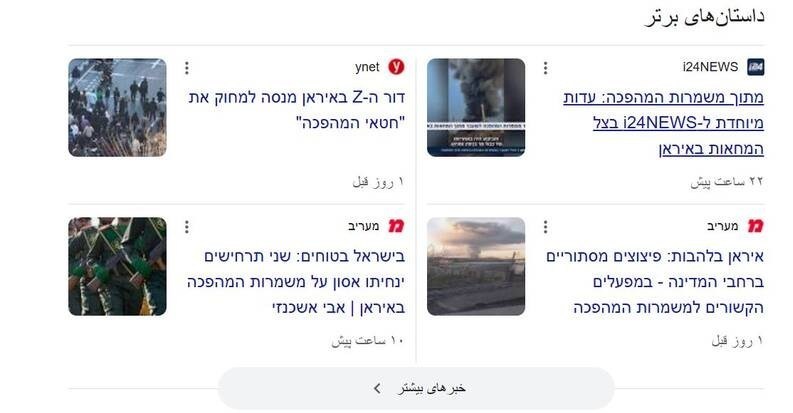 همانطور که در تصویر زیر مشخص است، با سرچ کلید واژه "انقلاب ایران" به زبان عبری، مجموعه گستردهای از اخبار و گزارشهای رسانهای ظاهر میشود که نشان از تمرکز بالای صهیونیستها بر روی تحولات ایران است.