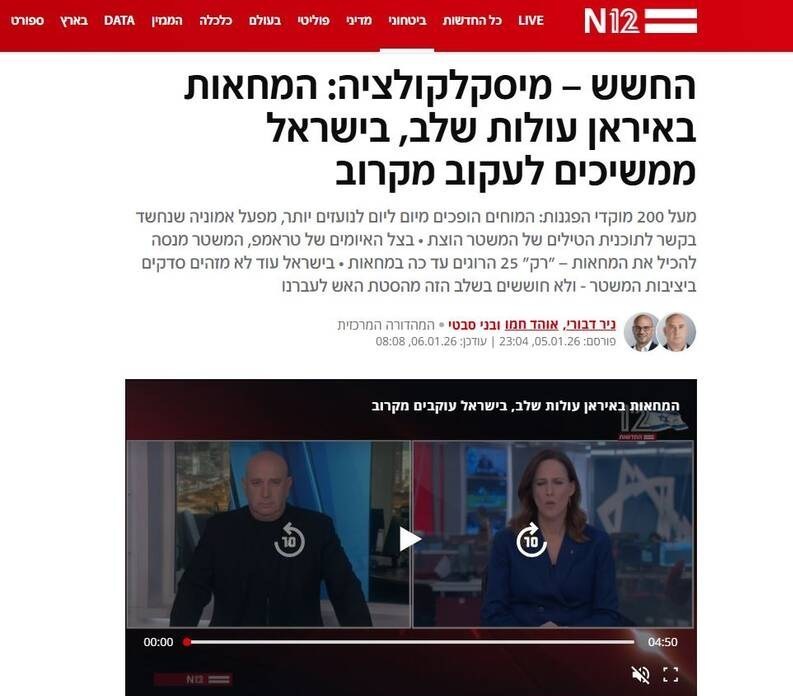 وب سایت شبکه 14 اسرائیل که وبسایت نزدیک به نخست وزیر رژیم صهیونیستی محسوب میشود، علیرغم هستههای محدود آشوب در ایران، مدعی میشود که جمعیت گستردهای در ایران به خیابانها آمده و تظاهرات در حال گسترش است. این ادعای شبکه 14 رژیم صهیونیستی درحالی است که تمامی امور به اقتصادی، اجتماعی و سیاسی در تمامی نقاط کشور به روال عادی خود ادامه میدهند و فعالیت برخی از هستههای اوباش وابسته به رژیم صهیونیستی هیچ خللی در امور جاری ایجاد نکرده است.