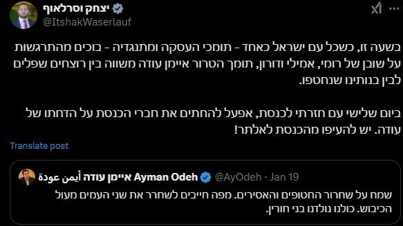 וסרלאוף התחייב לגרש את איימן עודה מהכנסת בגלל פוסט X על עסקת חטופים.