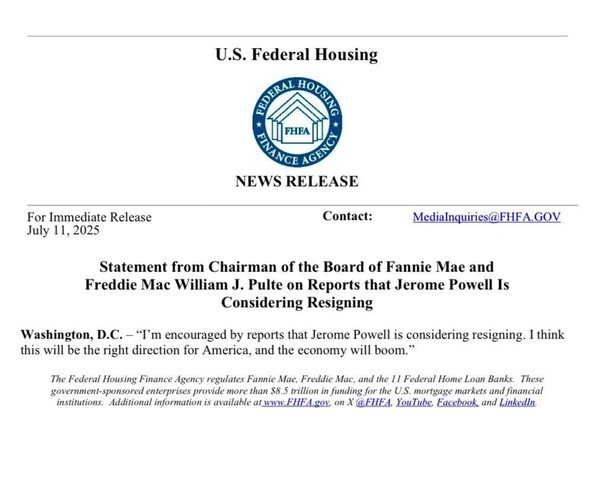 Некоторые аналитики считают, что недавние заявления Федерального агентства по финансированию жилищного строительства США (FHFA) могут свидетельствовать о скрытом давлении со стороны Белого дома с целью заставить Пауэлла подать в отставку, хотя официальные источники пока не делали никаких заявлений по этому поводу.