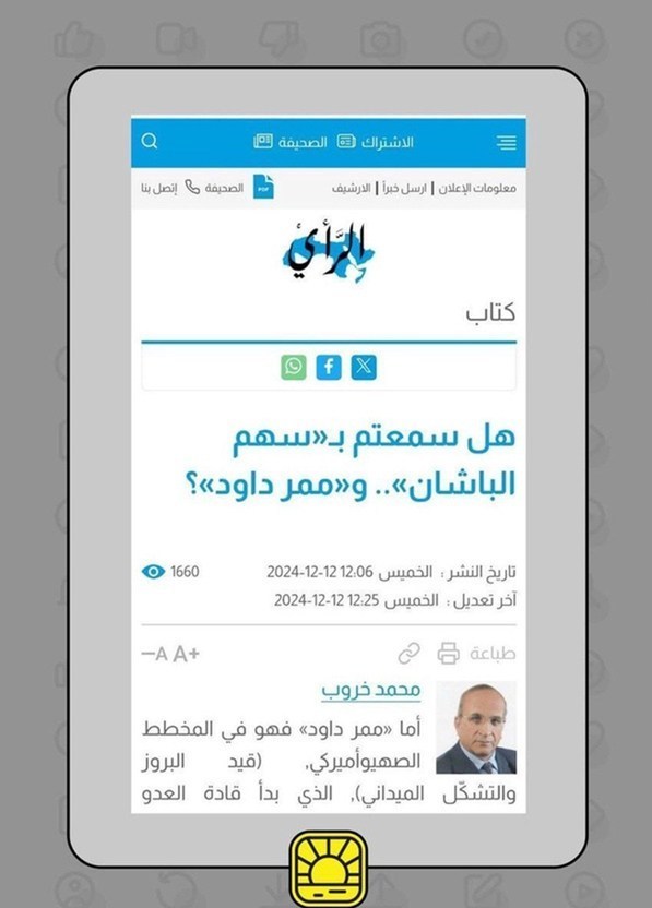 Арабские журналисты, в том числе Мохаммед Хуруб в иорданской газете «Аль-Pай», недавно раскрыли, что целью этого плана является разделение Сирии на три части: друзское государство на юге, курдское государство на севере и ослабленное центральное правительство, остающееся в Дамаске.