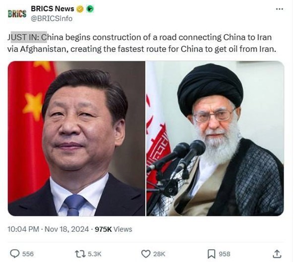 Председатель КНP Си Цзиньпин заявил на виртуальном аккаунте БPИКС, что Китай начинает строительство дороги через Афганистан для выхода к Ирану и Западной Азии.