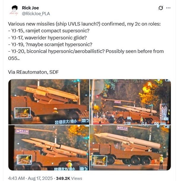 Среди этих предположений наибольшее внимание привлекли четыре недавно представленные ракеты: YJ-15, YJ-17, YJ-19 и YJ-20. Их предназначение, дальность и способ запуска пока неизвестны.